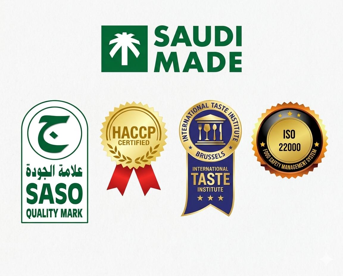 أبرز شهادات الجودة وسلامة الغذاء، تشمل ISO 22000، HACCP، علامة الجودة السعودية (SASO)، وشهادة التذوق العالمية، مما يعكس الالتزام بأعلى معايير الجودة